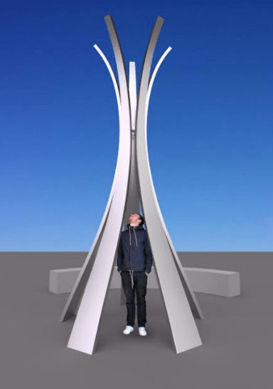 El crecimiento lineal y progresivo de cada ala representan el valor constante y sostenido de su legado. Su materialidad, el acero, provoca un efecto de luminosidad que pasa desde el gris oscuro al gris claro y azulado. Este efecto recuerda la proyección del evangelio entre hombres y mujeres, y que la santidad está al alcance de todo ser humano sin distinción.